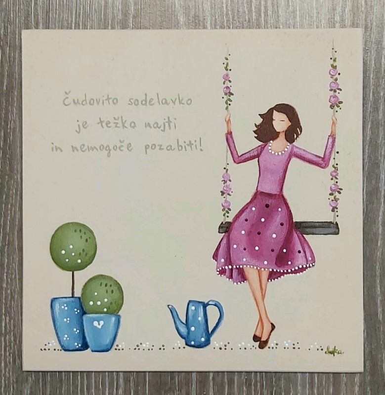 Lesena tablica z avtorsko ilustracijo, poslikana z akrilnimi barvami. Velikost 20 cm x 20 cm.