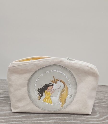 Peresnica z motivom deklice in samoroga velikosti 20 x 12 cm. Zapiranje na zadrgo. Izdelana je iz 100% bombaža s certifikatom GOTS in je potiskana z okolju prijaznimi barvami na vodni osnovi.