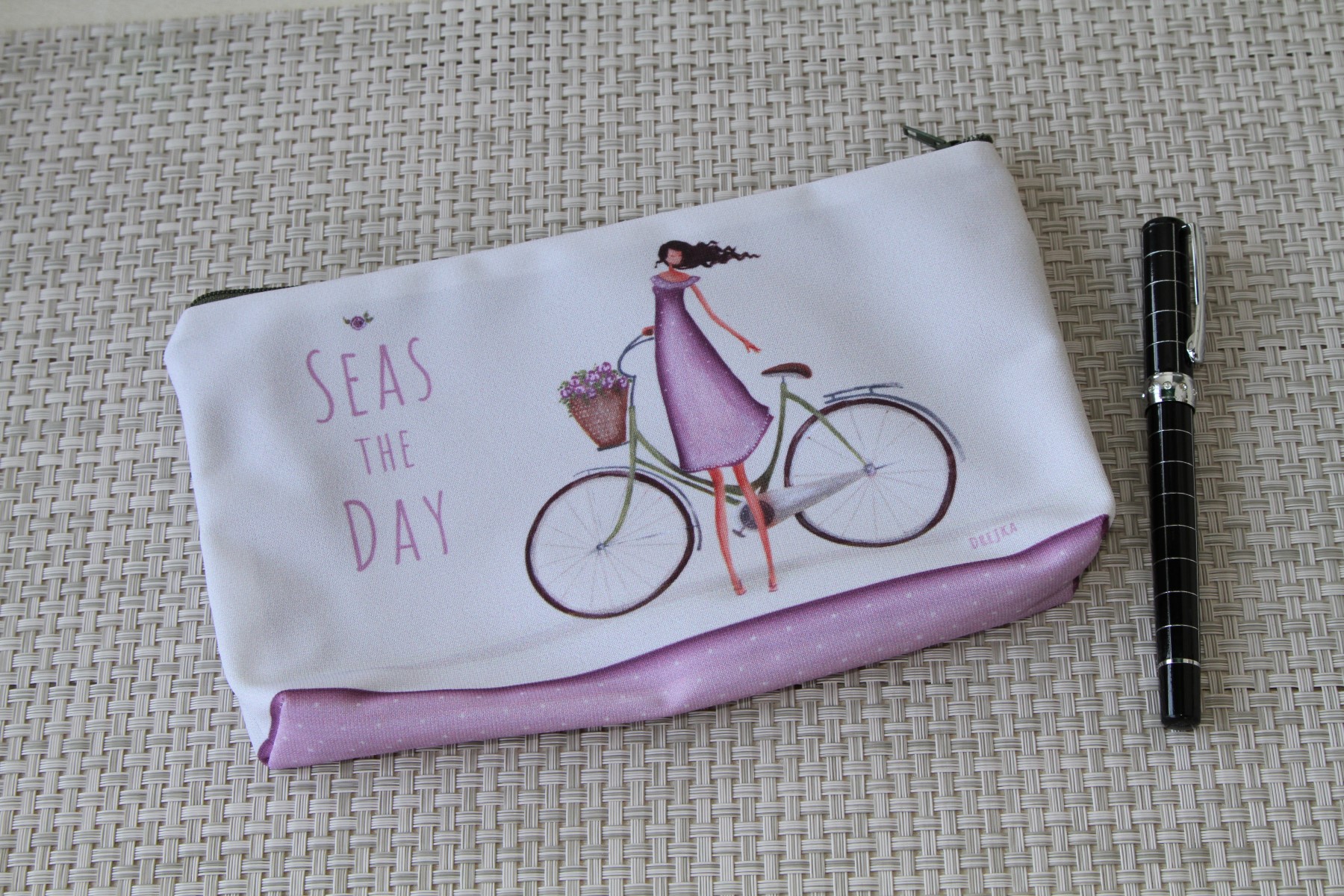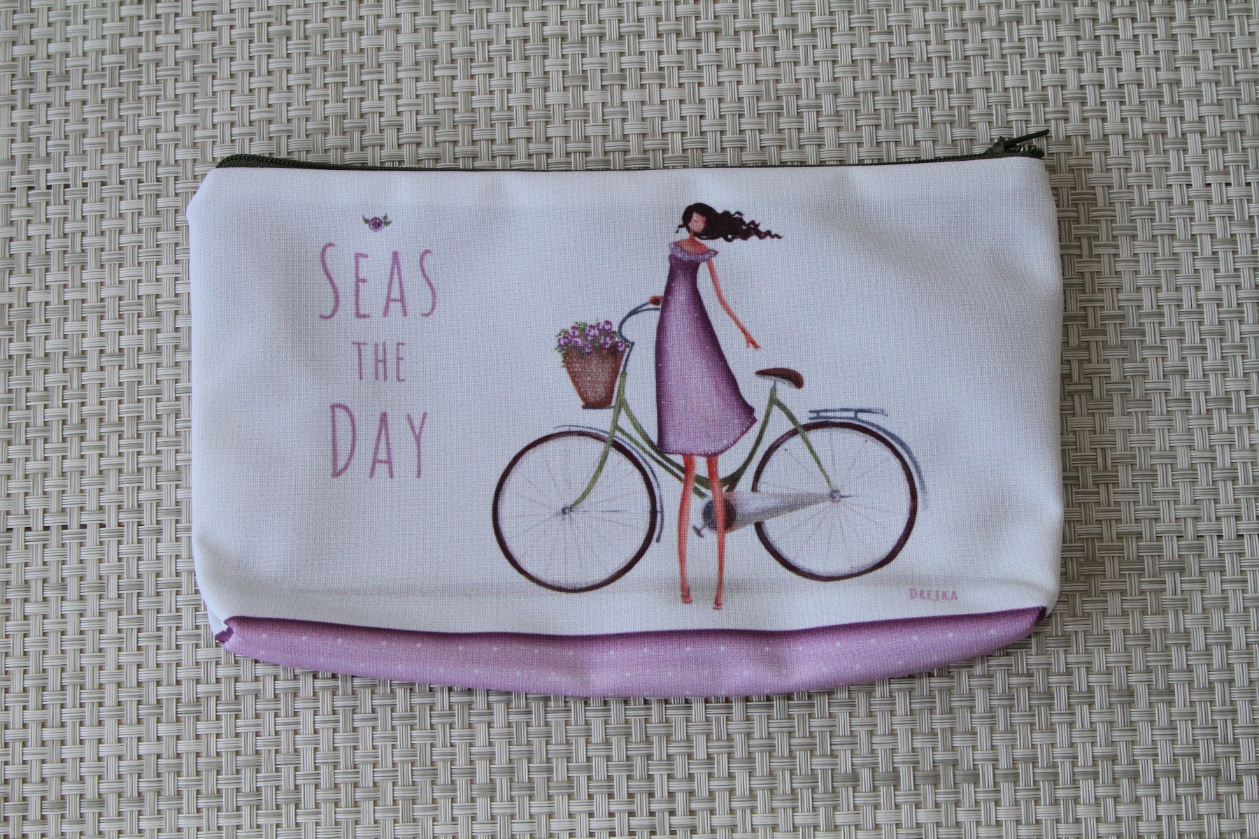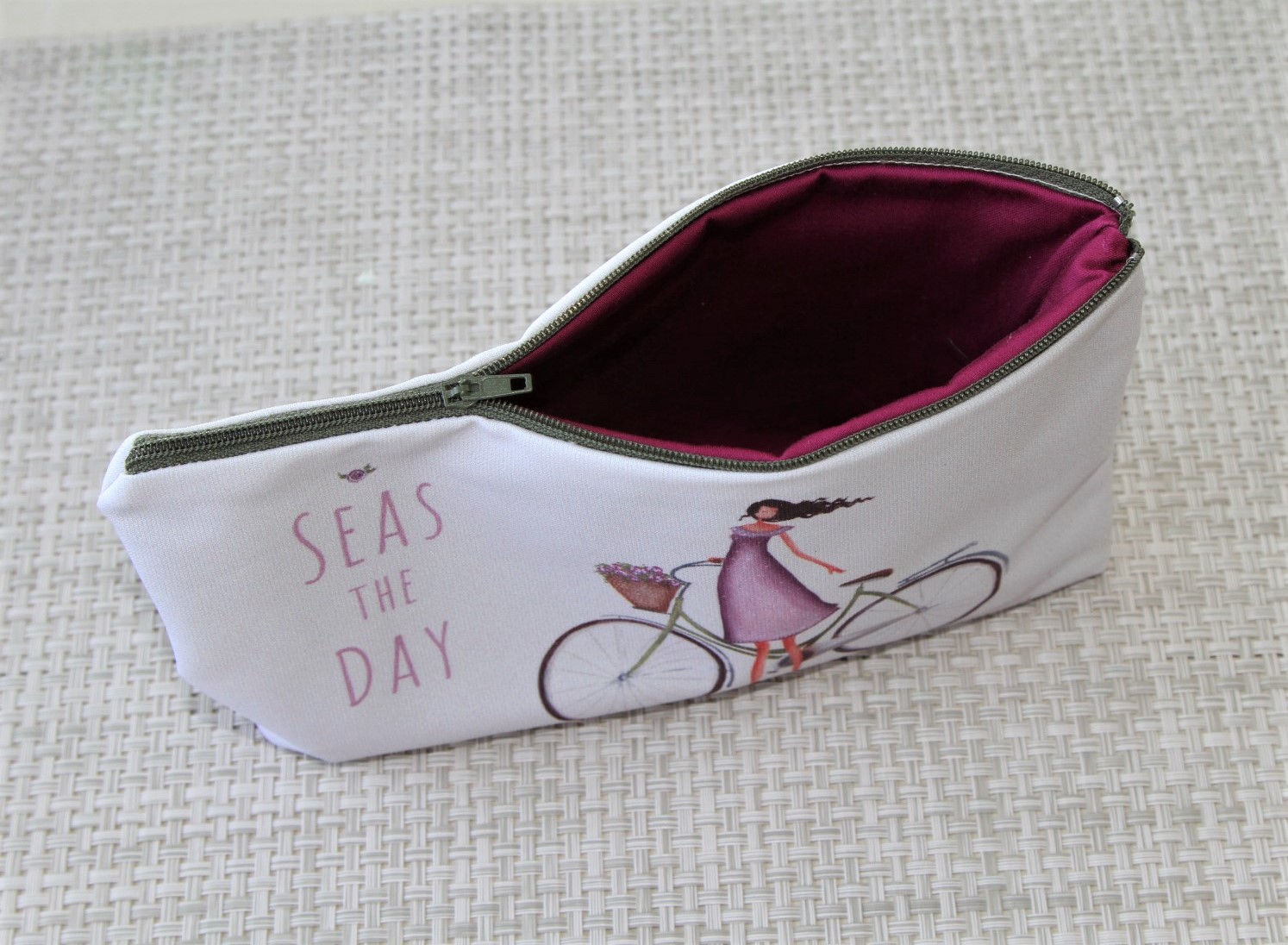 Peresnica velikosti 23 x 13 cm, z natisnjenim avtorskim motivom ‘Seas the day’. Zapiranje na zadrgo.