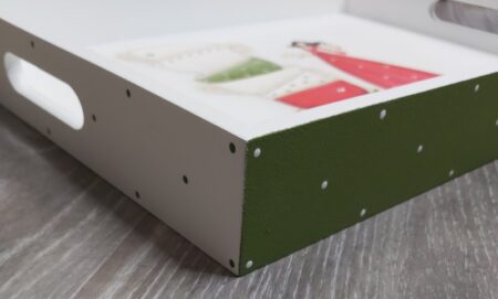 Lesen pladenj, poslikan z akrilnimi barvami, velikosti 40 cm x 30 cm x 5 cm.