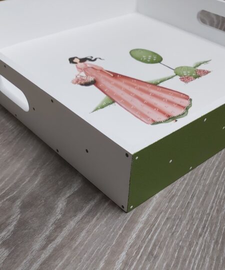 Lesen pladenj, poslikan z akrilnimi barvami, velikosti 35 cm x 35 cm x 6 cm.