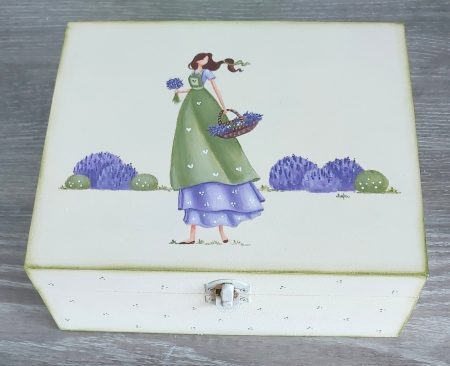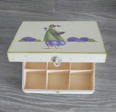 Lesena škatlica z dekorativno ilustracijo, primerna za posebne priložnosti, npr. darilo za rojstni dan, za mentorico, za penzijo …, velikost 23 cm x 20 cm x 7,5 cm. Škatlica je v notranjosti razdeljena na 9 manjših prostorčkov (7 x 6 cm), v katere na pregleden napin pospravite svoj šivalni pribor, sukance, gumbke, gumice, sponke …